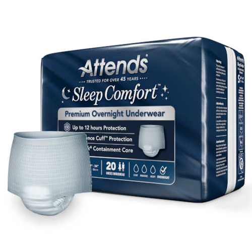 Attends Sleep Comfort Premium Overnight Underwear from HealthyKin.com provides maximum protection and comfort for a restful, uninterrupted night of sleep. https://www.healthykin.com/images/product/icon/7305.jpghttps://www.healthykin.com//p-7305-attends-sleep-comfort-premium-overnight-underwear.aspxSCPO10